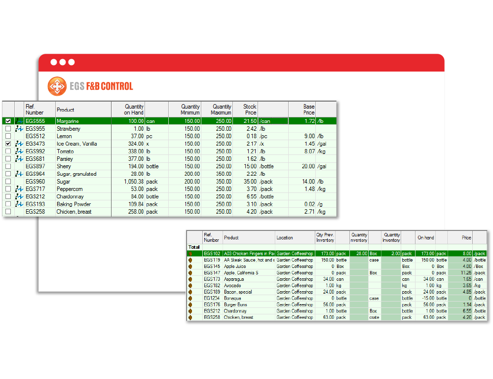 EGS F&B Control is a complete back-of-house system specifically designed for the food service industry to help companies reduce food costs, maximize business efficiency, and increase profitability. By optimizing inventory management, sales, and food cost variance reports, EGS F&B Control gives you total control of your business.